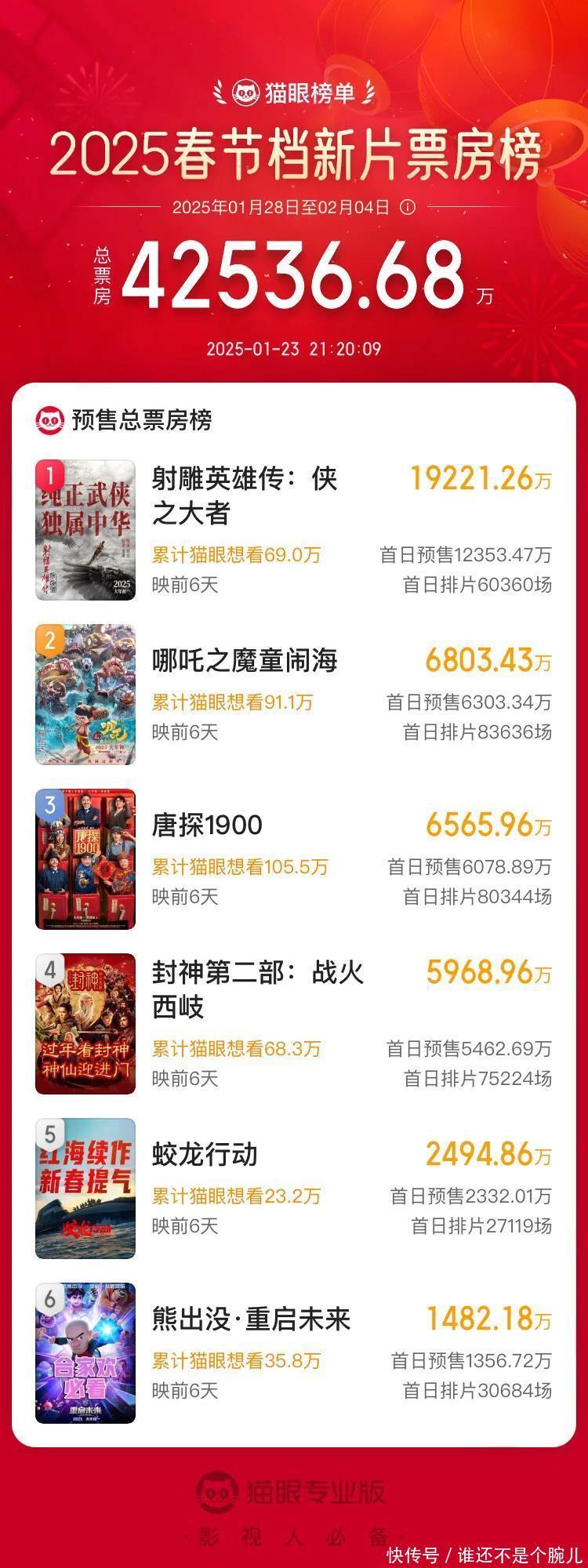1月23日,距离农历新年的脚步可以说是越来越近了,而春节档预售也是火力全开,刚刚,春节档已经正式突破4亿大关,六部新片表现强势,获得不少网友的关注和热议。